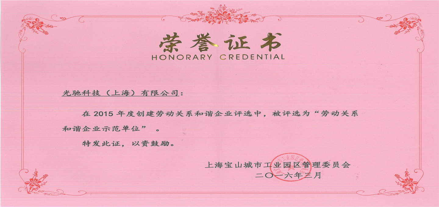 榮獲”2015年度寶山城市工業(yè)園區(qū)勞動關系和諧企業(yè)“